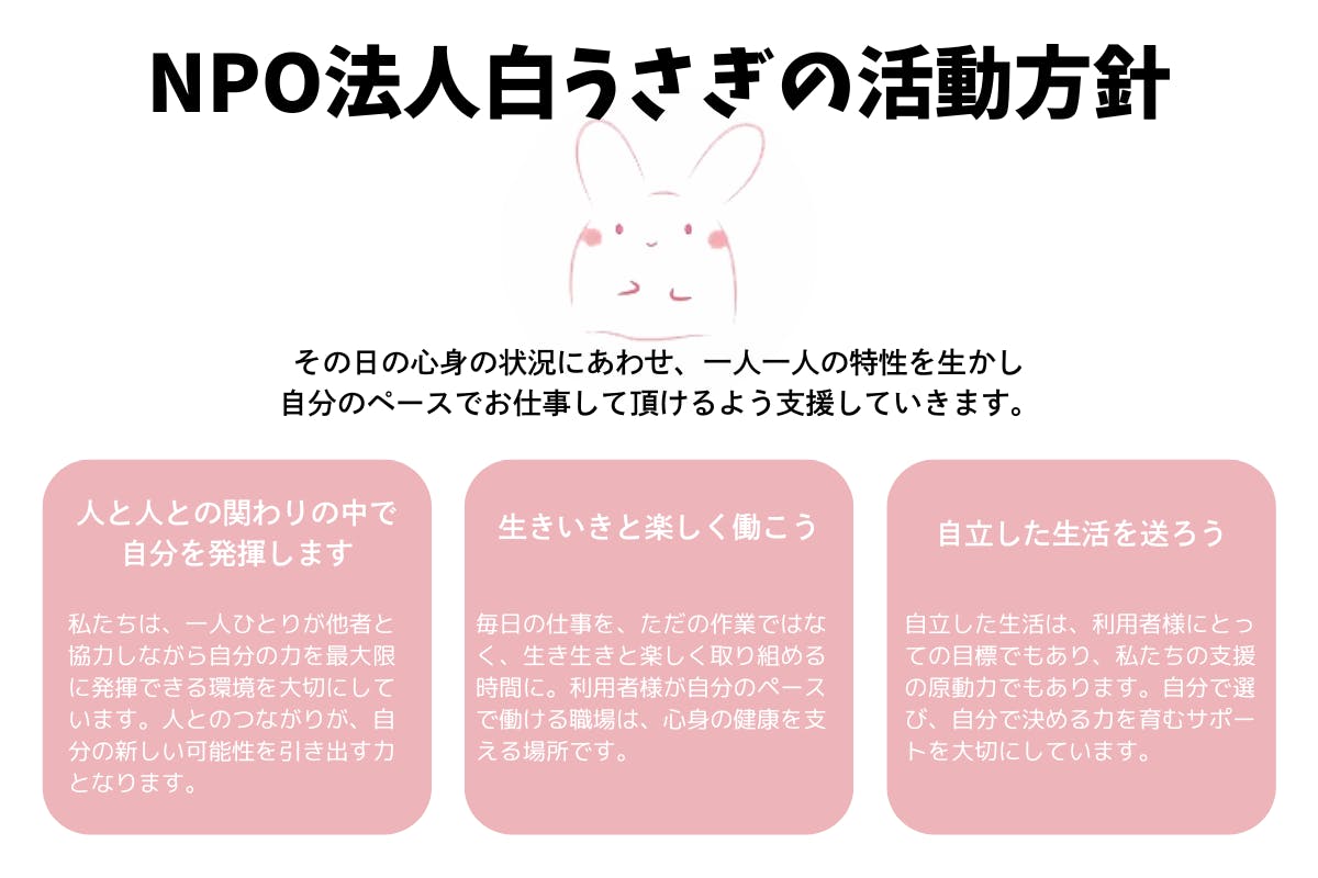 私どものNPO法人白うさぎは、スタッフの育成にも力を入れており、皆さまに楽しく気持ちよく利用していただけるよう日々精進しております。優しいスタッフばかりですので、些細なことでも構いません、お気軽にご相談頂ければと存じます。